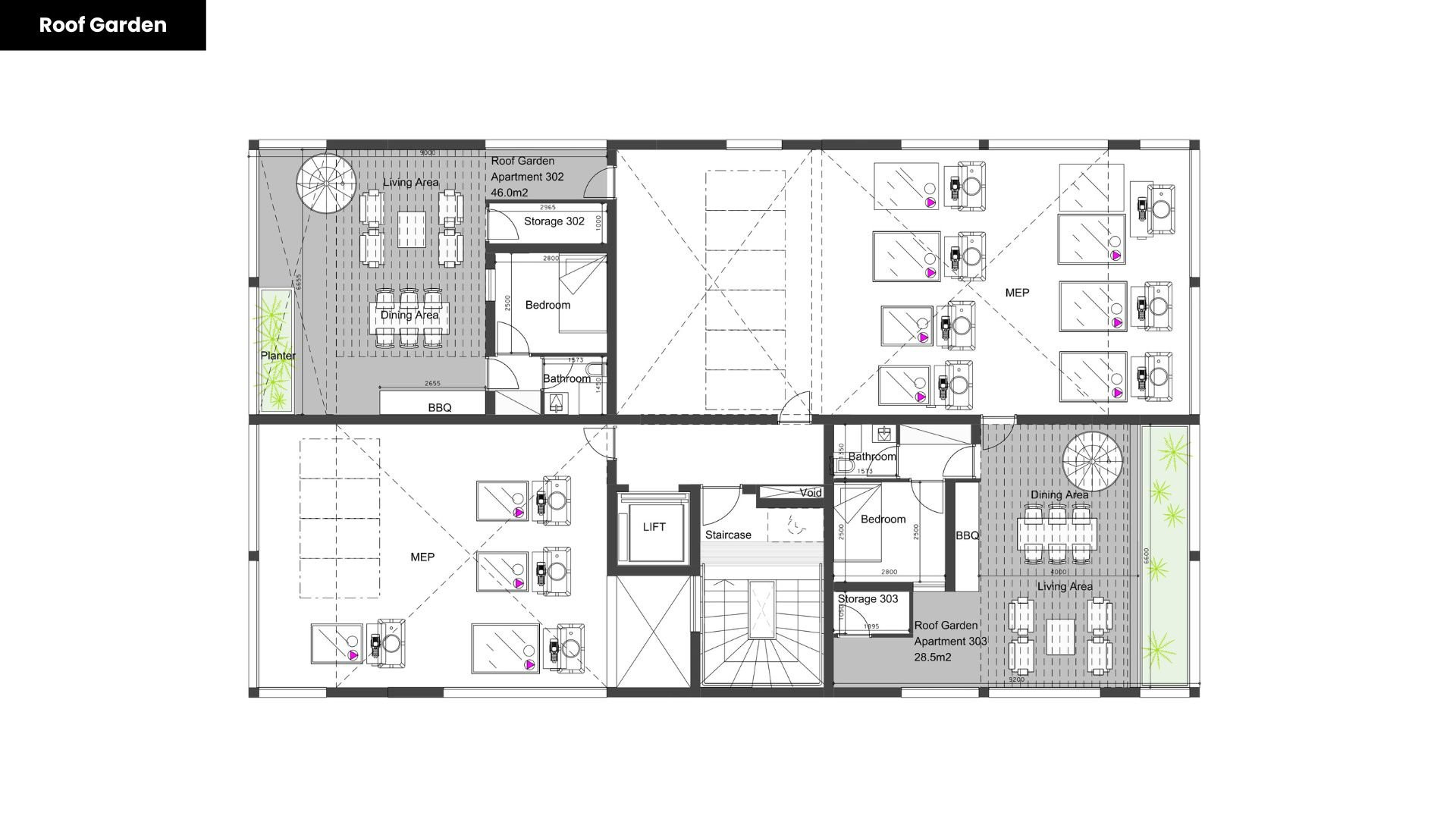 | Status | Reference | Type | Floor | Parking spaces | Bedrooms | Bathrooms | Covered m2 | Covered veranda m2 | Roof garden m2 | Storage m2 | Total Area | VAT | Estimated Monthly Rental Income | Monthly Rental Guarantee |