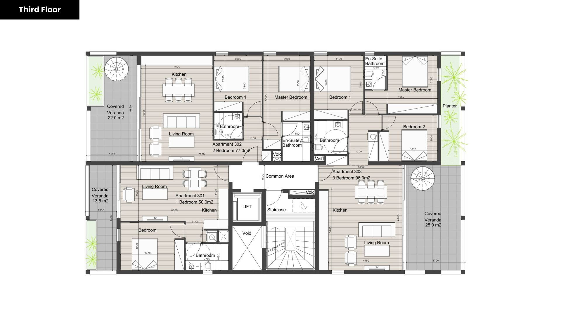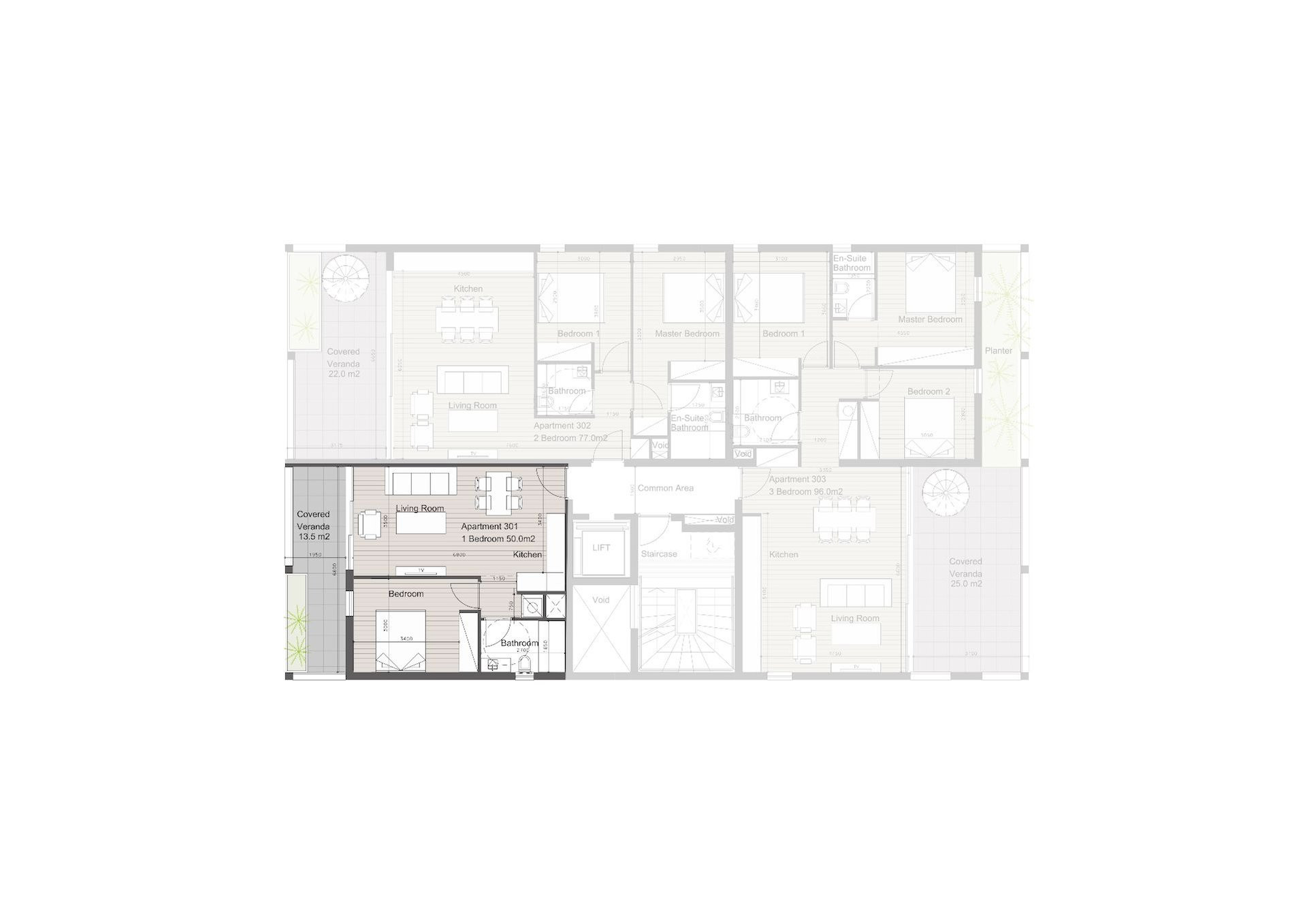 | 303 | Apartment | 3 | 1 | 3 | 2 | 96 | 25 | 36 | - | 157 | - | 2850 | - |