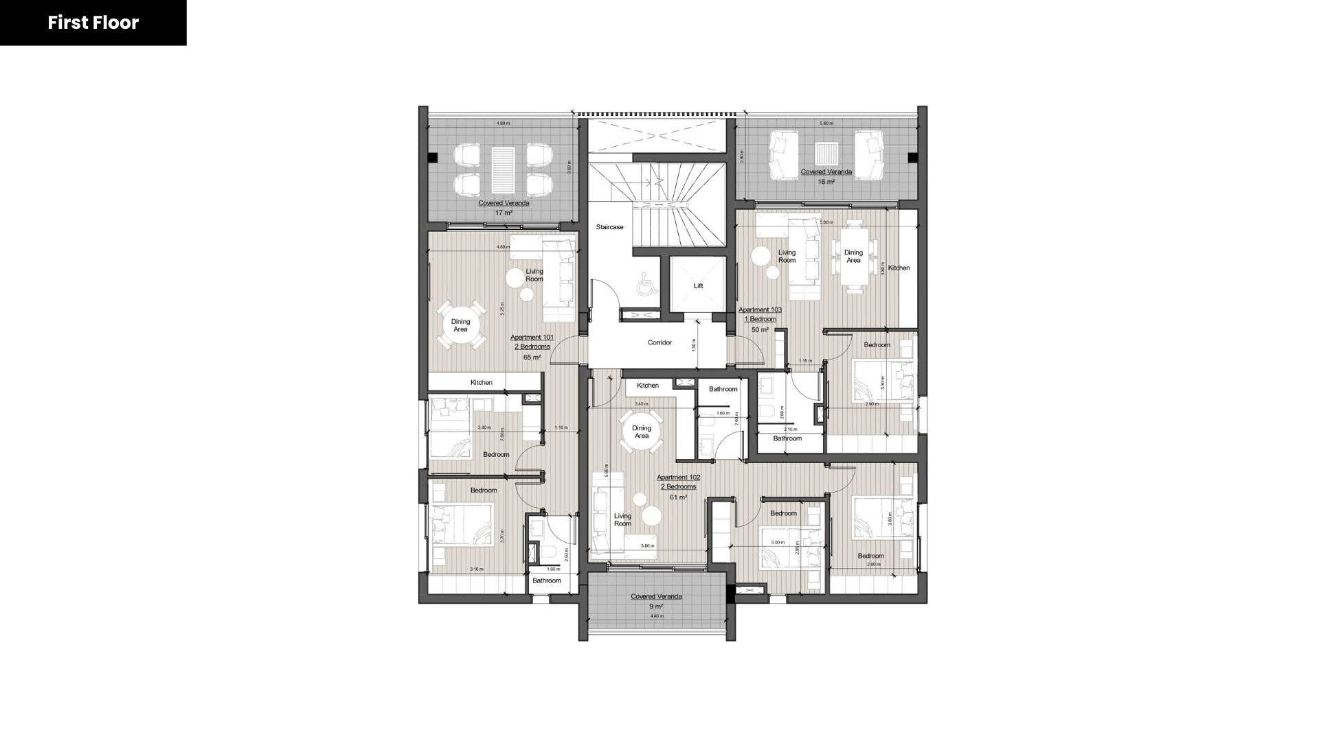| 102 | Apartment | 1 | 1 | 2 | 1 | 61 | 9 | - | 70 | - | 2550 | 1550 | |